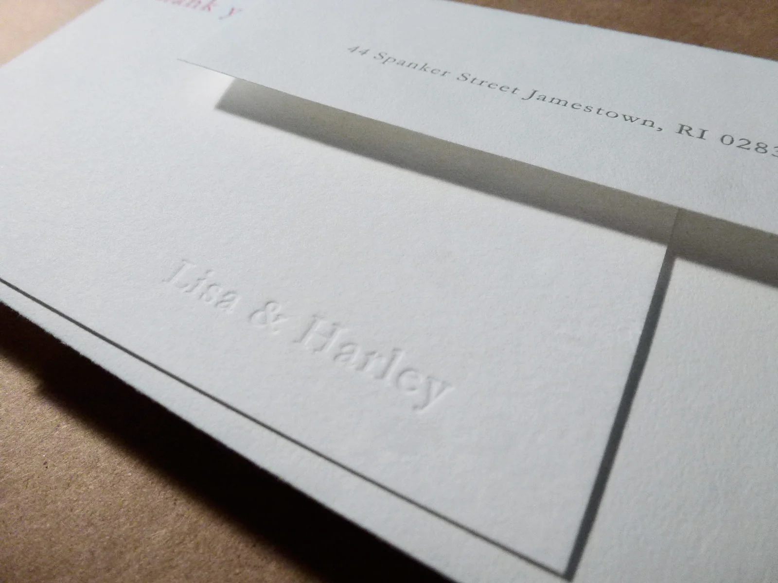 2 color wedding invitation, rsvp card, and blind debossed thank you cards from collaborative design, printed on 110# Crane's Lettra cotton stock.