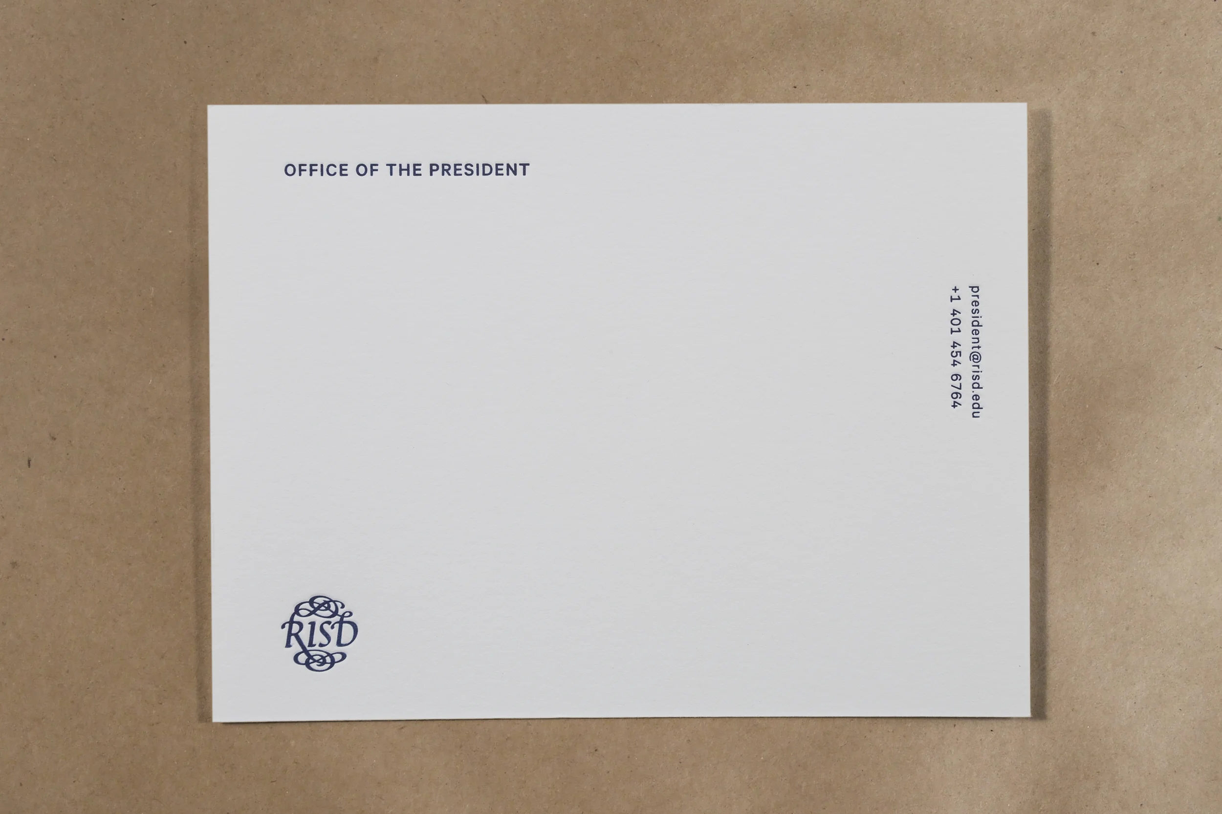 President's single color notecard set from supplied design, printed from polymer plates on 110# Crane's Lettra cover with Colorplan Real Grey envelopes..